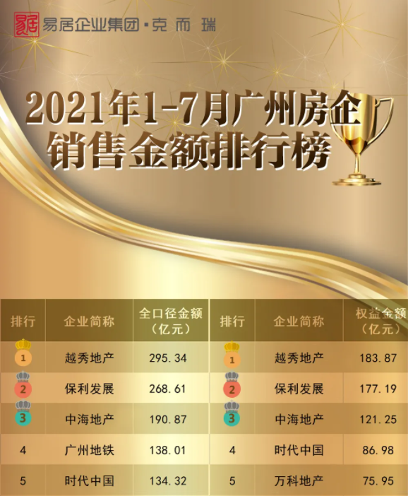 8月6日,克而瑞独家发布《2021年1-7月广州房企销售榜》,ag尊龙地产以亮眼业绩表现再次斩获权益金额榜、全口径金额榜双料第一。
